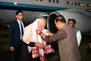 উল্লেখ্য যে দুদিনীয়া ভ্রমণসূচীৰে শনিবাৰে বিয়লিৰ ভাগত গুৱাহাটীত উপস্থিত হোৱা প্রধানমন্ত্রী নৰেন্দ্ৰ মোদীক ৰাজ্যপাল লক্ষ্মণ প্রসাদ আচাৰ্য আৰু মুখ্যমন্ত্রী ড° হিমন্ত বিশ্ব শৰ্মাই বিমানবন্দৰত উষ্ম আদৰণি জনায়। ইয়াৰ পিছতে সৰুসজাইলৈ অহা প্রধানমন্ত্ৰীগৰাকীক শংখ, ঘণ্টা, ঢোল, পেঁপা, তালেৰে আদৰণি জনোৱা হয়। সৰুসজাইৰ বাণ্ডৰুম্বা অনুষ্ঠানৰ পাছতেই এক লেজাৰ শ্ব’ৰো অনুষ্ঠান হয়। প্রধানমন্ত্রীৰ এই আগমনক বড়ো শিল্পীসকলে ম’বাইলৰ পোহৰেৰে আদৰণি-ধন্যবাদ জ্ঞাপন কৰে। বাগুৰুম্বা দ’হৌৰ এই অনুষ্ঠানত কেন্দ্রীয় মন্ত্রী সর্বানন্দ সোণোৱাল, পৱিত্ৰ মাৰ্ঘেৰিটা, সাংসদ বিজুলী কলিতা মেধি, বিধানসভাৰ অধ্যক্ষ বিশ্বজিৎ দৈমাৰী, বিটিচি প্রধান হাগ্রামা মহিলাৰী, মন্ত্ৰী বিমল বড়াৰ লগতে কেইবাগৰাকীও মন্ত্রী, সাংসদ, বিধায়ক আৰু বিশিষ্ট ব্যক্তিসকল উপস্থিত থাকে।