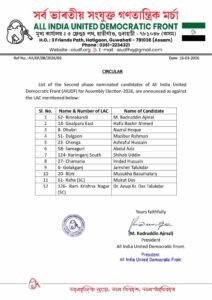 এআইইউডিএফৰ দ্বিতীয়খন প্ৰাৰ্থী তালিকা ঘোষণা