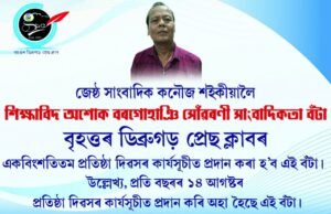 জ্যেষ্ঠ সাংবাদিক কনৌজ শইকীয়ালৈ শিক্ষাবিদ অশোক বৰগোহাঞি সোঁৱৰণী সাংবাদিকতা বঁটা ঘোষণা:বৃহত্তৰ ডিব্ৰুগড় প্ৰেছ ক্লাবৰ একবিংশতিতম প্ৰতিষ্ঠা দিৱসত প্ৰদান কৰা হ’ব বঁটা