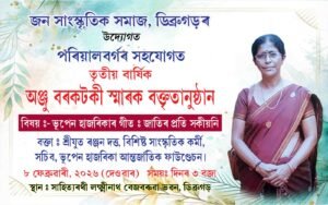 ডিব্ৰুগড়ৰ জন সাংস্কৃতিক সমাজৰ উদ্যোগত অঞ্জু বৰকটকী স্মাৰক বক্তৃতানুষ্ঠান ৮ ফেব্ৰুৱাৰীত