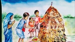 অলপ সময়ৰ পাছত দেউতা মই ready হৈ গ’লো,এতিয়া কোৱা।শুনা আঘোণ- পুহ মাহতে কৃষিজীৱি লোকে ধান চপাই ভঁৰাল নতুন ধানেৰে পুৰ কৰে।বাৰীত শাক-পাচলি উভয়নদী হয়।ৰঙা আলু,কাঠ আলু,মোৱা আলুৰ দৰে বিভিন্ন আলু হয়।ৰঙা আলু! সেইটো দেখোন খোৱাই নাই।তেনেতে মাকে বোলে চিল্কী তুমি পাহঁৰিছা।মই যে যোৱাবাৰ লালমোহন বনাইছিলো।তুমিযে ভাল পাইছিলা সেই আলুটো আকৌ।এই আলুটো পোৰিও খাই ।তুমি যে তেলত ভাজি দিলে ভাল পোৱা কাঠ আলু সেইটো এই বিহুতেই ওলায়।এতিয়া আকৌ দেউতাৰ পৰা শুনা।সকলোৱে পিঠা-লাৰু, সান্দহ, চিৰা আদিৰে ঘৰ ভৰাই ৰাখে।পুখুৰীত মাছ কেইজনীয়েও মোক খা মোক খা কৰে মুঠৰ ওপৰত বস্তু উভয় নদী হোৱাৰ কাৰণে মাঘ বিহুক ভোগালী বিহু বুলি কয়।তাৰ উপৰিও মাঘৰ বিহুৰ সকলোতকৈ ভাল লগা পৰম্পৰা হৈছে মেজি জ্বলোৱা প্ৰথা।মেজি জ্বলাবলৈ কাঠ বা খেৰৰ ওখ দ’ম লাগে।বহু ঠাইত এনে মেজি কলগছৰ শুকান পাত, নৰা আদিৰে তৈয়াৰ কৰে। মাঘ বিহুৰ উৰুকাৰ নিশা মেজি জ্বলাই ভেলাঘৰত ভোজ ভাত খাই আনন্দ কৰে আৰু পিছদিনা মেজি জ্বলাই অগ্নি দেৱতাক পূজা কৰে যাতে বছৰ তোলৈ বিভিন্ন অপায়-অমঙ্গলৰ পৰা সকলোকে আতঁৰাই ৰাখে।মেজিক সেৱা কৰা মন্ত্ৰটো তোমাৰ মনত আছেনে?অলপ আছে বাকী পাহৰিছো।শুনা তেনেহ’লে