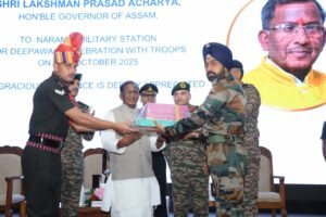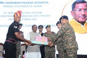 Guwahati, Rongili Barta: In a gesture reflecting deep respect and solidarity with the nation’s defenders, Assam Governor Shri Lakshman Prasad Acharya visited the 51 Sub-Area of Indian army and exchanged greetings with the jawans of the Indian armed forces at Narangi Military Station on the auspicious occasion of Diwali.